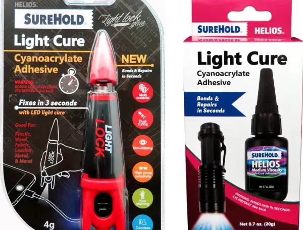 SureHold Helios Light Lock Glue, the world’s first odorless light cure cyanoacrylate adhesive system. The dual bonding technology combines a premium high quality glue with a blazingly fast light cure. Helios light cure cyanoacrylates are a new and revolutionary adhesive that was developed in response to demand for an adhesive that offered all the advantages of cyanoacrylates and light cure adhesives, yet none of the limitations.